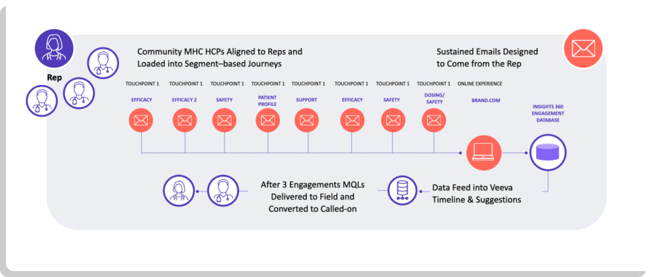 Creation of an actionable audience persona enabled creation of messages based on personalized need. Platform integration allowed the sales representative to “continue the conversation” with engaged HCPs and deliver a connected brand experience